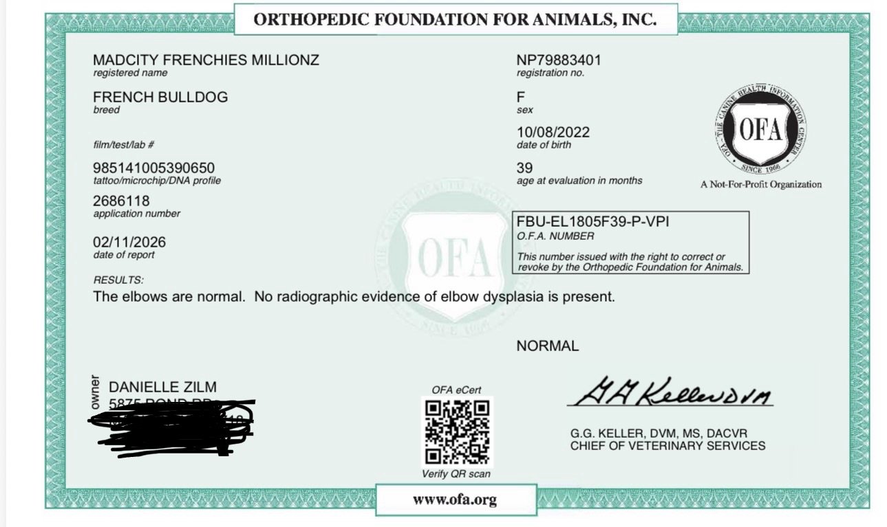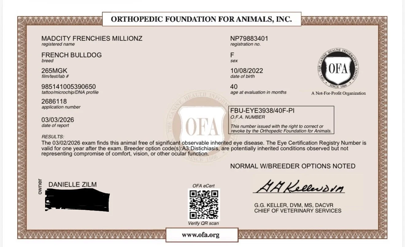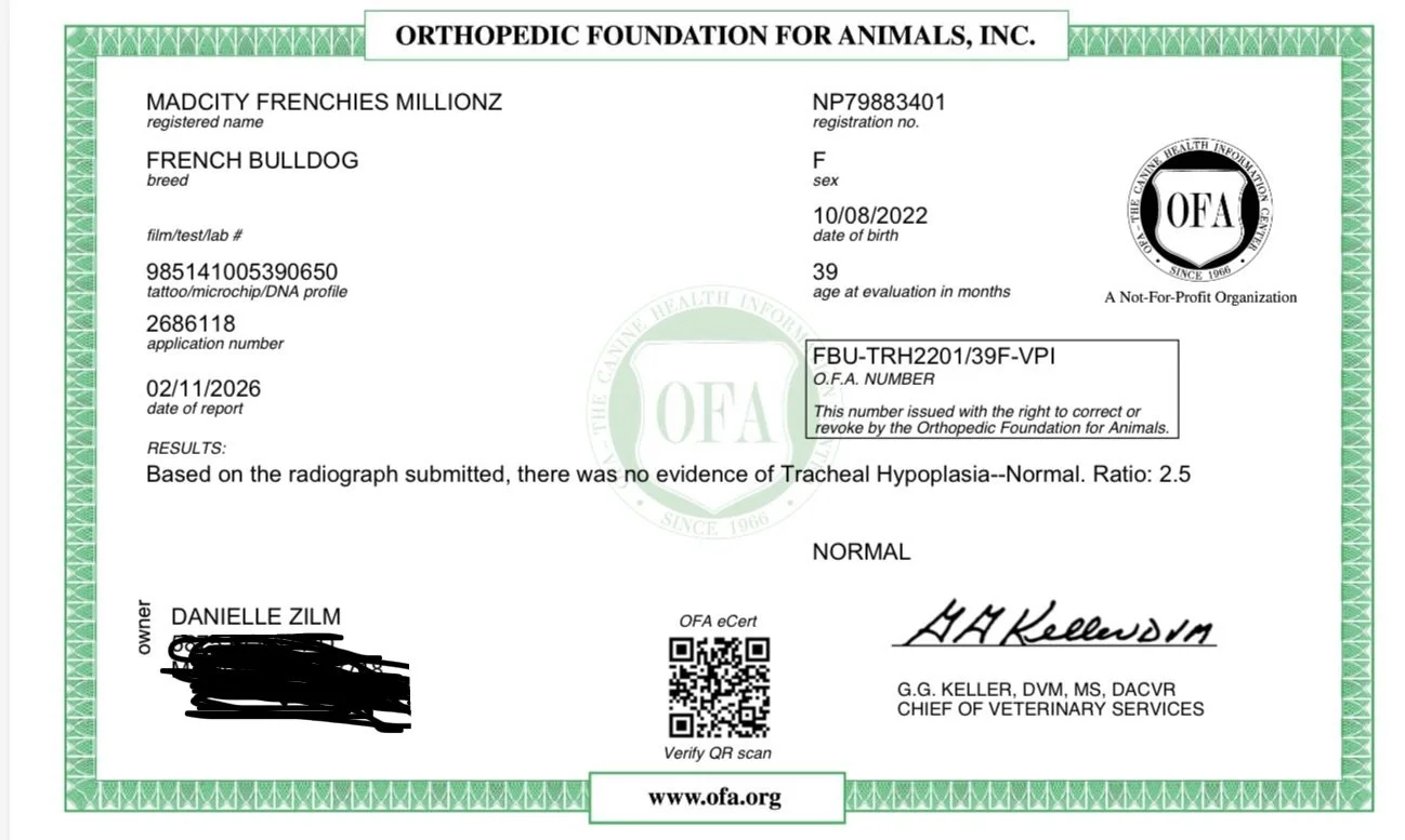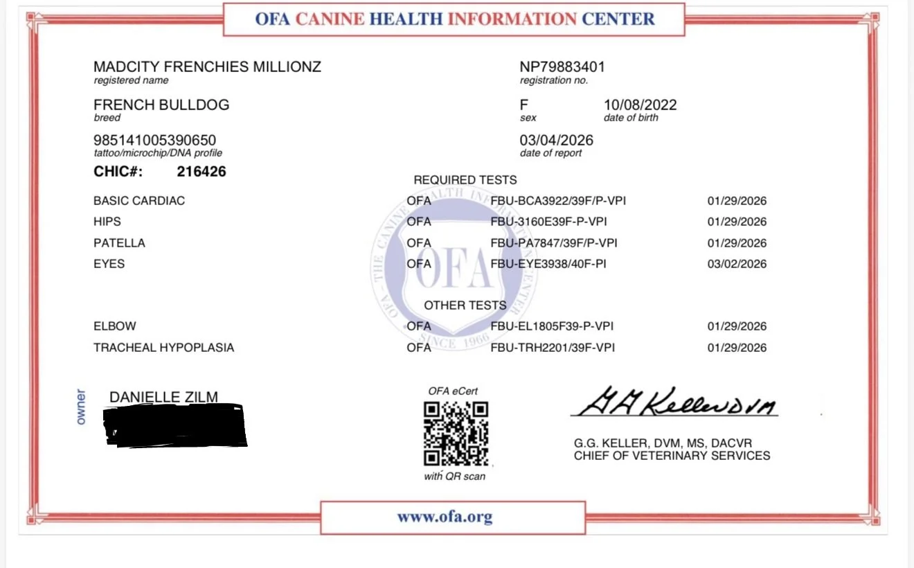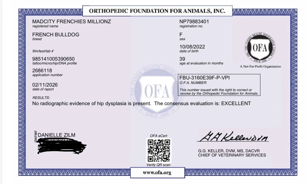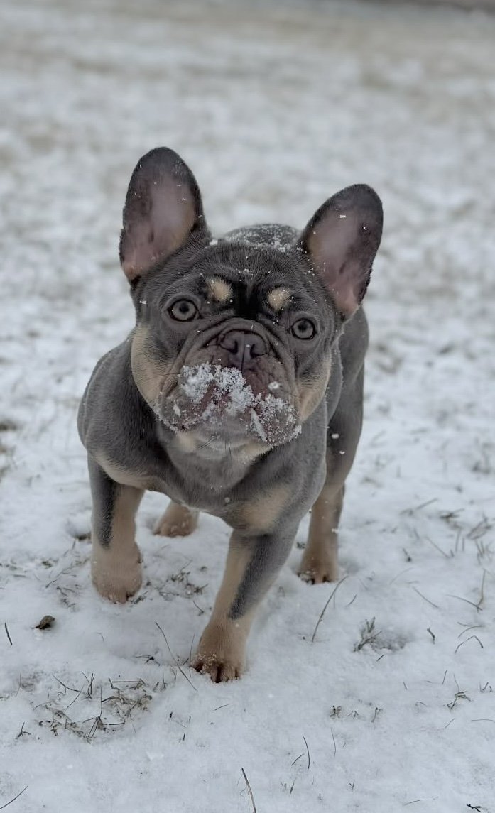 Milli is a small lilac and tan female weighing 21 pounds. She is the goofiest of the group, with a kind, sweet nature and a genuine love for everyone she meets. Milli has completed her genetic, DNA, OFA health testing and CHIC certification, with EXCELLENT results, a rarity in this breed. She is one of only 169 French Bulldogs in the US to have EXCELLENT hips. Only 3% are able to claim that fame, and we are very proud!! The certificates are attached below. She is expected to have her first litter in May 2026.