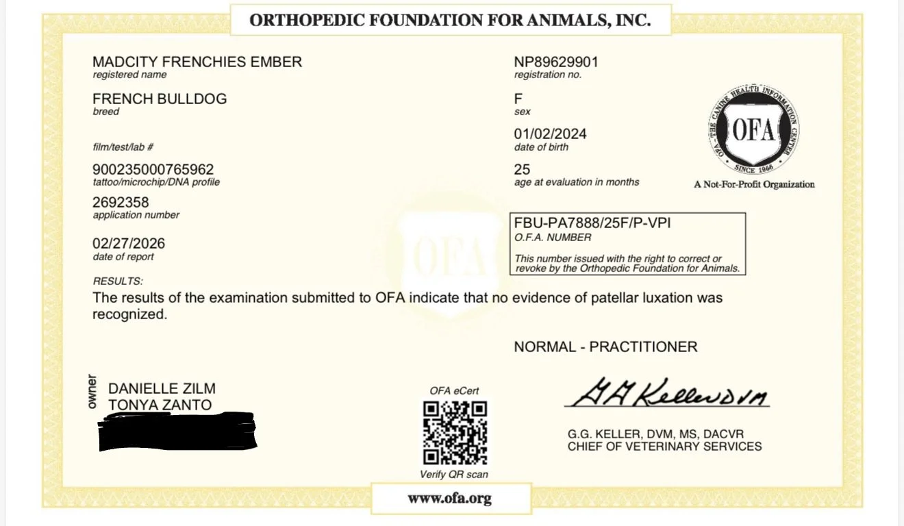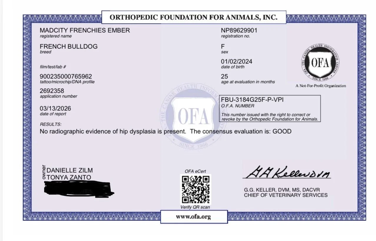 Ember is a beautiful red fawn with an ideal size, much like her mother, weighing 25 pounds. She has a fun, laid back personality and is intelligent and affectionate. Ember especially enjoys car rides. As Seven’s daughter, she represents the third generation of our breeding program. She has now completed her genetic, DNA and OFA health testing (minus her eye certification, she is on the waitlist to complete that), with very good results and is expected to have her first litter in May 2026.